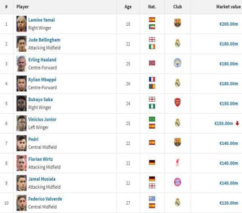 全球球員身價(jià)TOP10。這當(dāng)中西甲占據(jù)6席,此外還有英超的哈蘭德、薩卡和維爾茨,以及德甲的穆西亞拉。