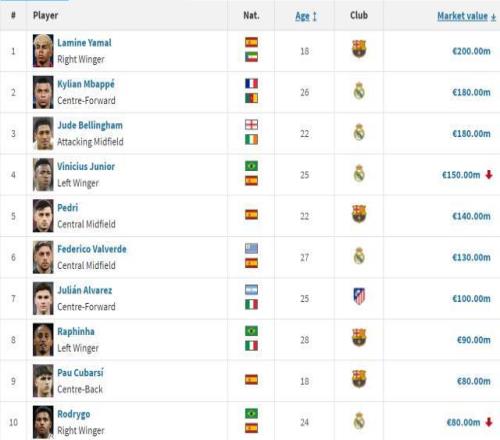 10月2日,德國(guó)“轉(zhuǎn)會(huì)市場(chǎng)”網(wǎng)站進(jìn)行了本賽季球員身價(jià)估值的首次重要調(diào)整。西甲成為五大聯(lián)賽中首個(gè)修正相關(guān)數(shù)據(jù)的聯(lián)賽,共166名球員的估值有所變動(dòng)。亞馬爾的身價(jià)維持在2億歐元,仍是西甲之最,也是全球之最。在巴薩超新星身后,是3名皇馬球員,其中貝林厄姆和姆巴佩保持1.8億不變,但一度同樣估值2億的維尼修斯再次下跌,由此前的1.7億降為1.5億。