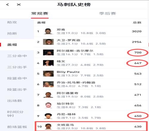 憑借新賽季前2戰(zhàn)的12記蓋帽,文班亞馬NBA生涯的總蓋帽數(shù)達(dá)到了430個,成功躋身馬刺隊史蓋帽榜前十,距離第9丹尼-格林的450個只差20個。