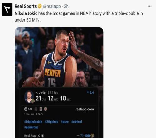 近兩個賽季約基奇就拿到了38次三雙,其中上賽季34次,本賽季4次,各項三雙數(shù)據(jù)均為同期聯(lián)盟第一,同時本場也是約基奇過去兩個賽季第23次在前三節(jié)就拿到三雙,同樣位列聯(lián)盟第一。