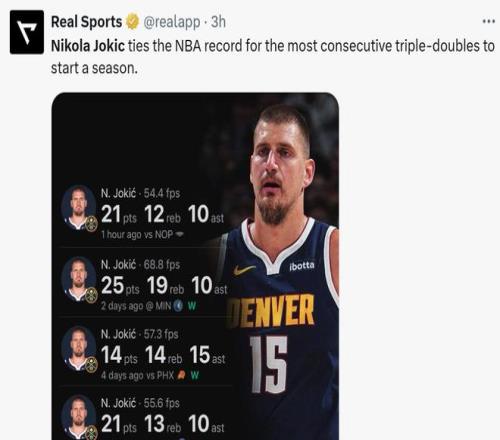 本場對陣鵜鶘隊,約基奇27分鐘三節(jié)打卡拿到21+12+10三雙數(shù)據(jù),開季至今4場比賽完成三雙4連擊神奇表現(xiàn)。