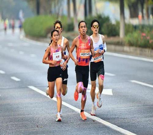 國(guó)際精英組成的第一集團(tuán)出發(fā)的配速很快,黃雪梅自己以325-326配速跟了兩公里后,就慢下來(lái)了,她邊跑邊等著從后面出發(fā)的丈夫陳志明追上來(lái)。隨后,倆人以330左右的配速并肩前行。