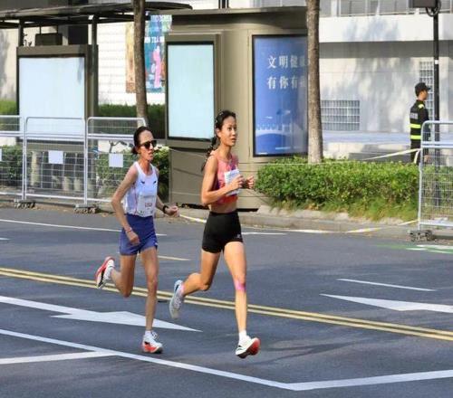 早晨7點(diǎn)的杭州,氣溫15度,相較更寒冷的西安,朱卿明顯感覺(jué)到今天的肌肉跑起來(lái)完全不一樣——有知覺(jué),腿也沒(méi)有打飄。前5公里,朱卿習(xí)慣先看看感覺(jué),也按照自己計(jì)劃中前半程76分到77分中的目標(biāo)去跑。因?yàn)橹篮蟀氤逃信郎缓门?,所以她想著那就?zhēng)取跑個(gè)235左右。但是沒(méi)想到跑了大概3-4公里時(shí),一位澳大利亞的跑者上來(lái)了,一直位于朱卿之前4-500米,而這也反而給朱卿帶來(lái)了動(dòng)力,“按照她PB成績(jī)來(lái)的話,她的成績(jī)比我好太多了。”在此前,還有三位水平更高的外籍黑人選手,從出發(fā)前就已經(jīng)沒(méi)了身影。朱卿想著那就跟著這位白人選手,爭(zhēng)取別被甩太遠(yuǎn),可能后面還有點(diǎn)機(jī)會(huì)。就在這樣“一直往前看”的念頭中,朱卿跑完前半程用了差不多75分鐘。