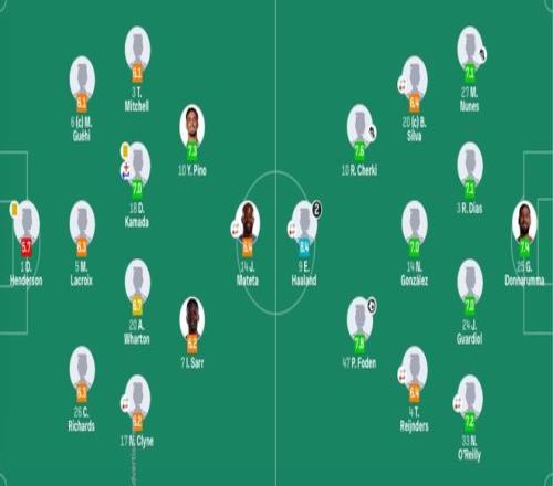 曼城首發(fā):25-多納魯馬、27-努內(nèi)斯、3-魯本·迪亞斯、24-格瓦迪奧爾、33-奧賴?yán)?1'21-努里)、14-尼科、20-B席(91'82-劉易斯)、4-賴因德斯(85'26-薩維尼奧)、47-福登、10-謝爾基、9-哈蘭德(91'7-馬爾穆什)